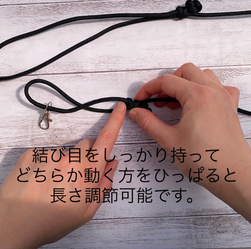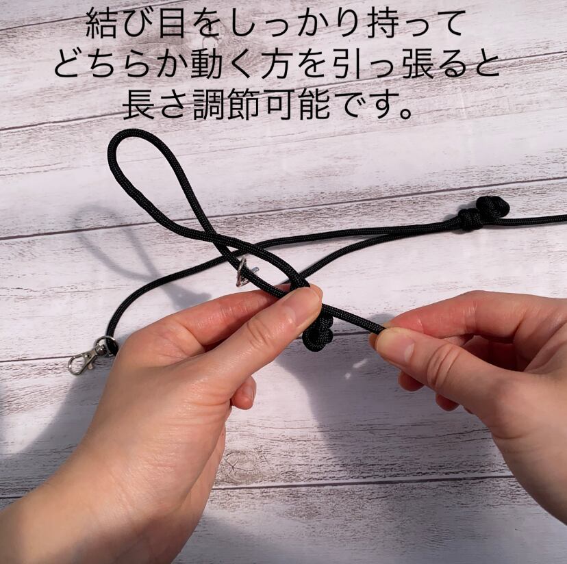 結び目が2つありますが、どちらの結び目もしっかりと持って、2本ある方のどちらかスムーズに動く方を引っ張ると長さの調節が可能です。