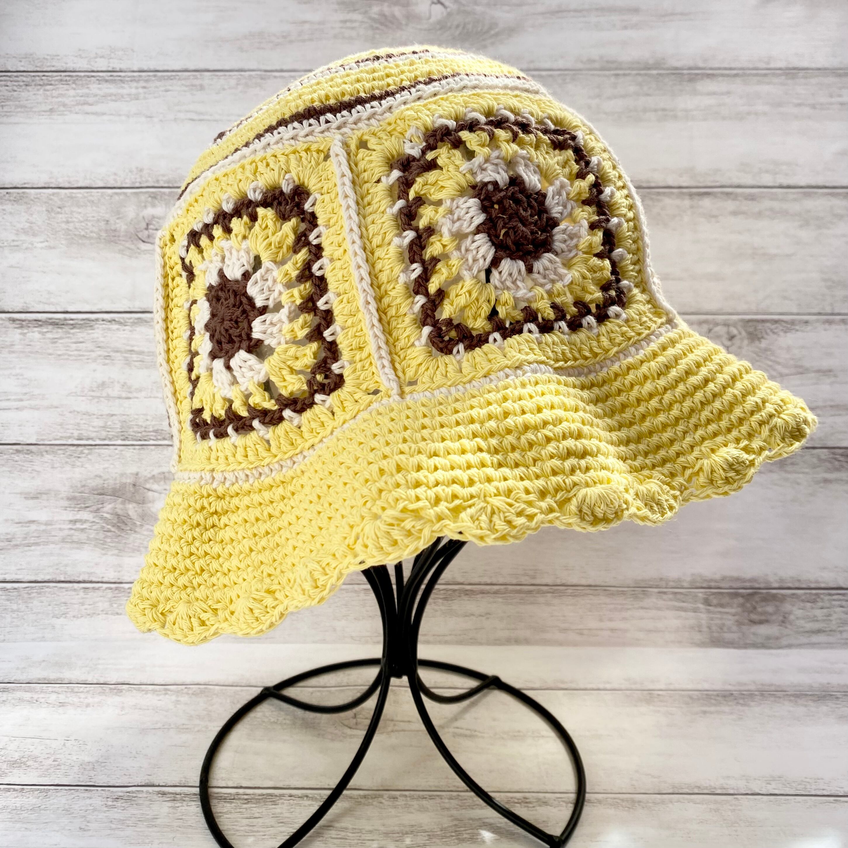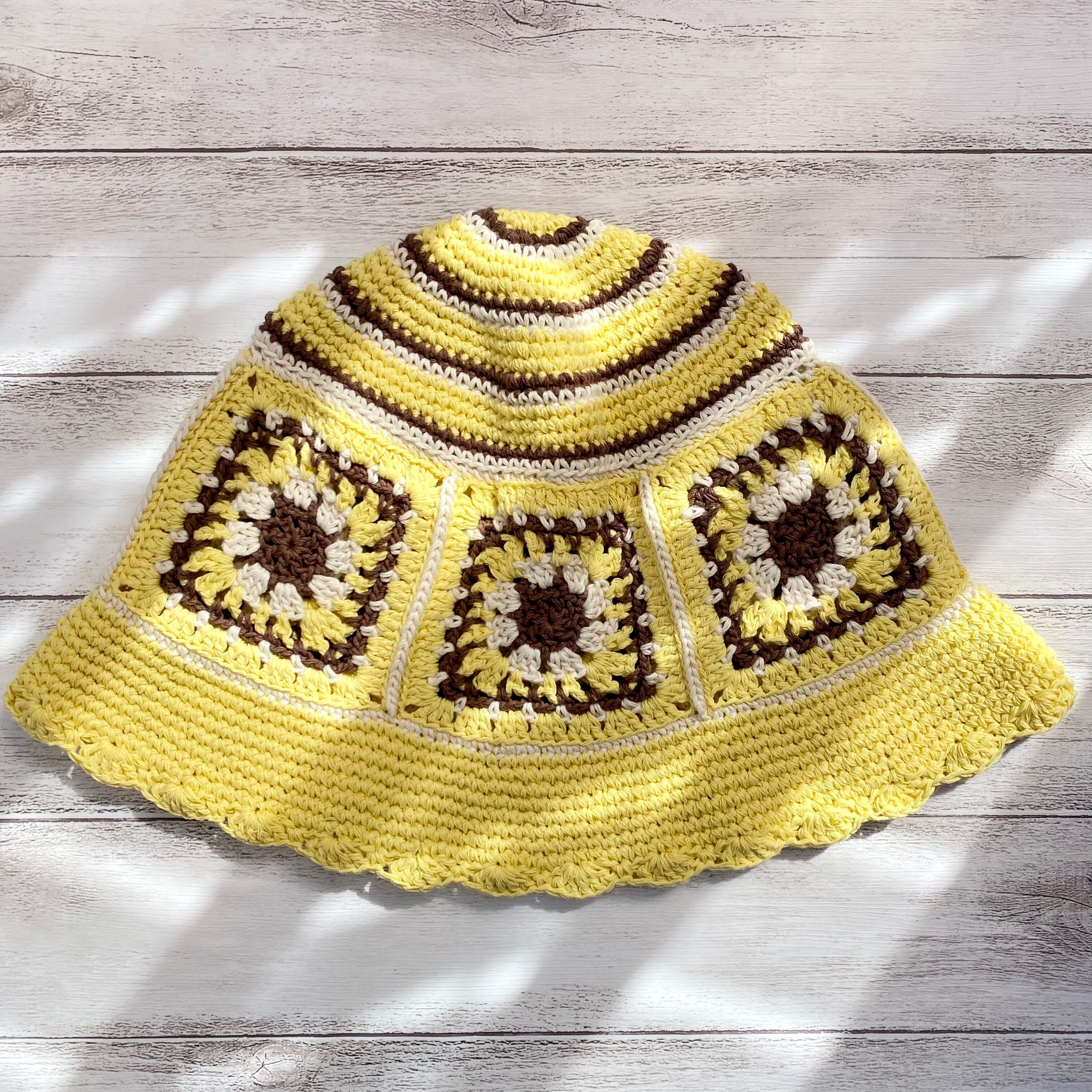 【NO.3122009】ハンドメイド クロシェハット グラニースクエア ハット クロシェ編み帽子 イエロー